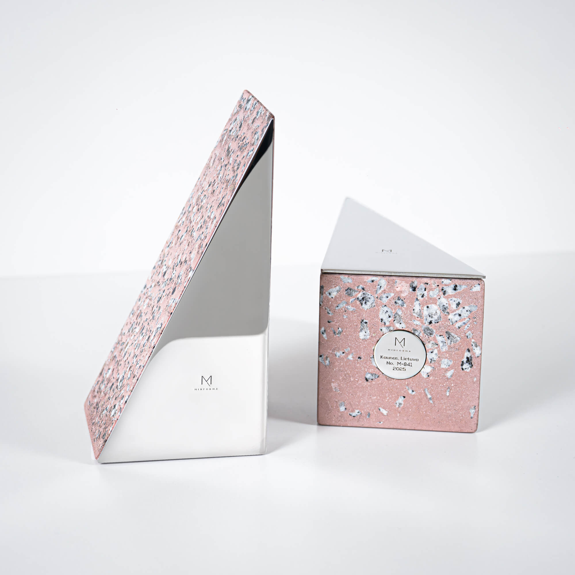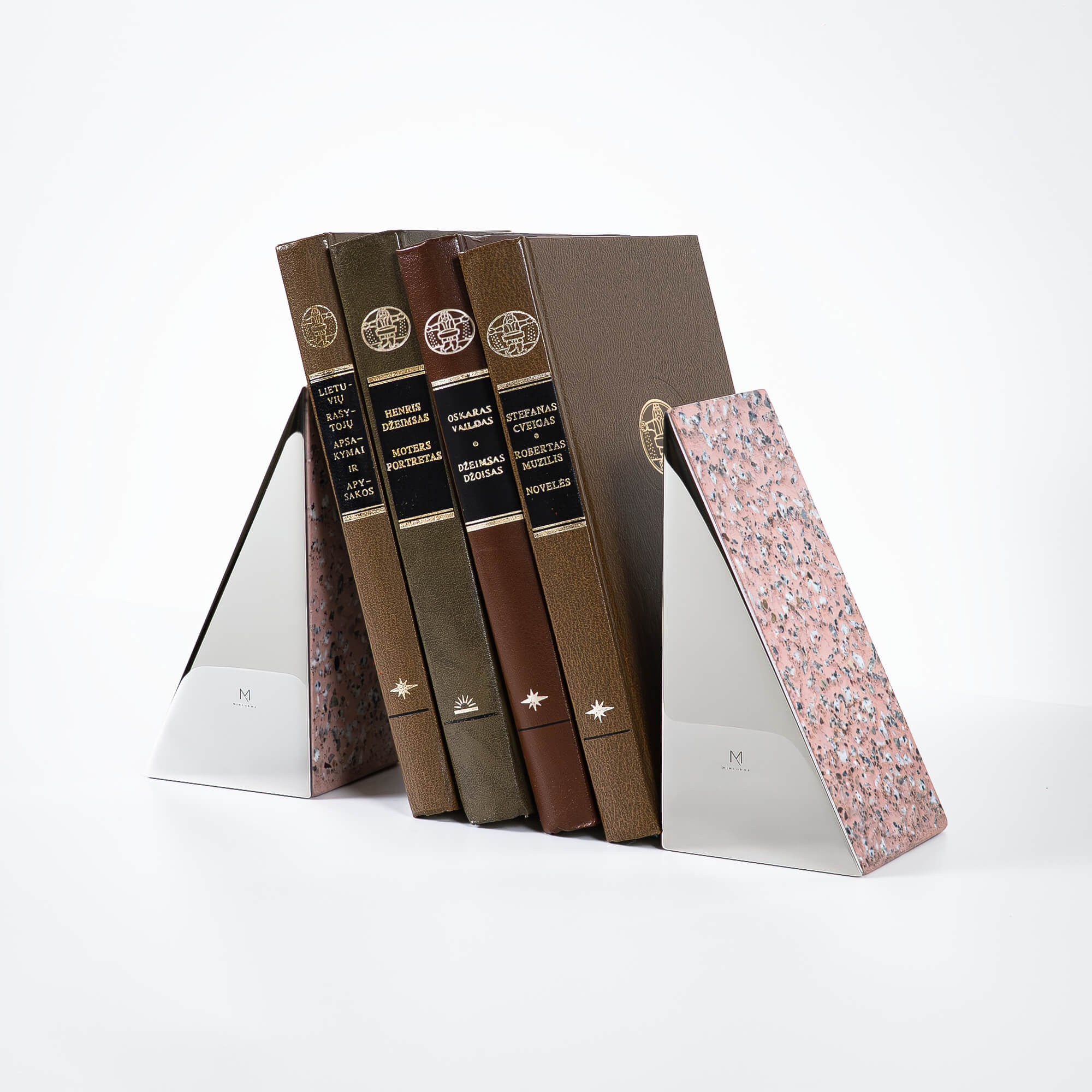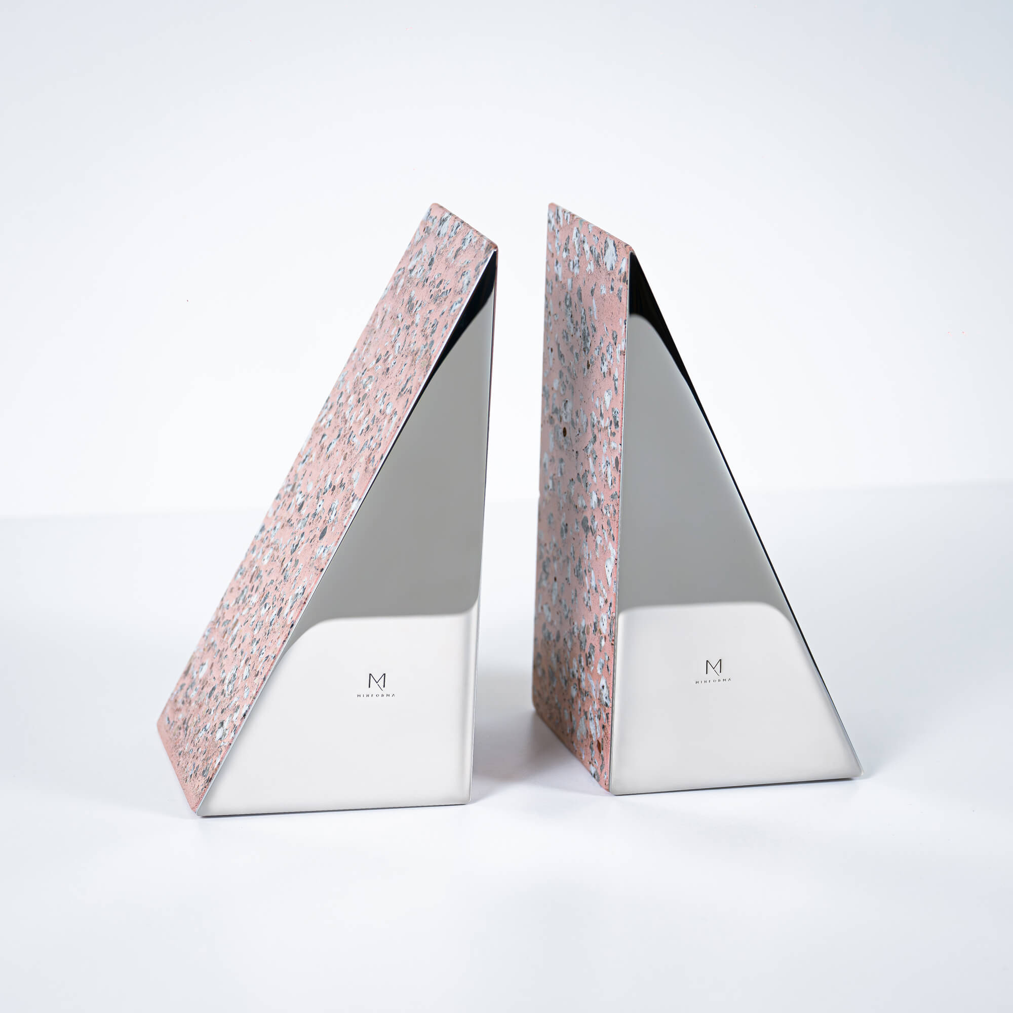 Handmade pink terrazzo bookends (set of 2) with mirror finished stainless steel plate. Exclusive and contemporary accessory for home or office interior. Bookends are solid, stable and perfectly hold books of any size.