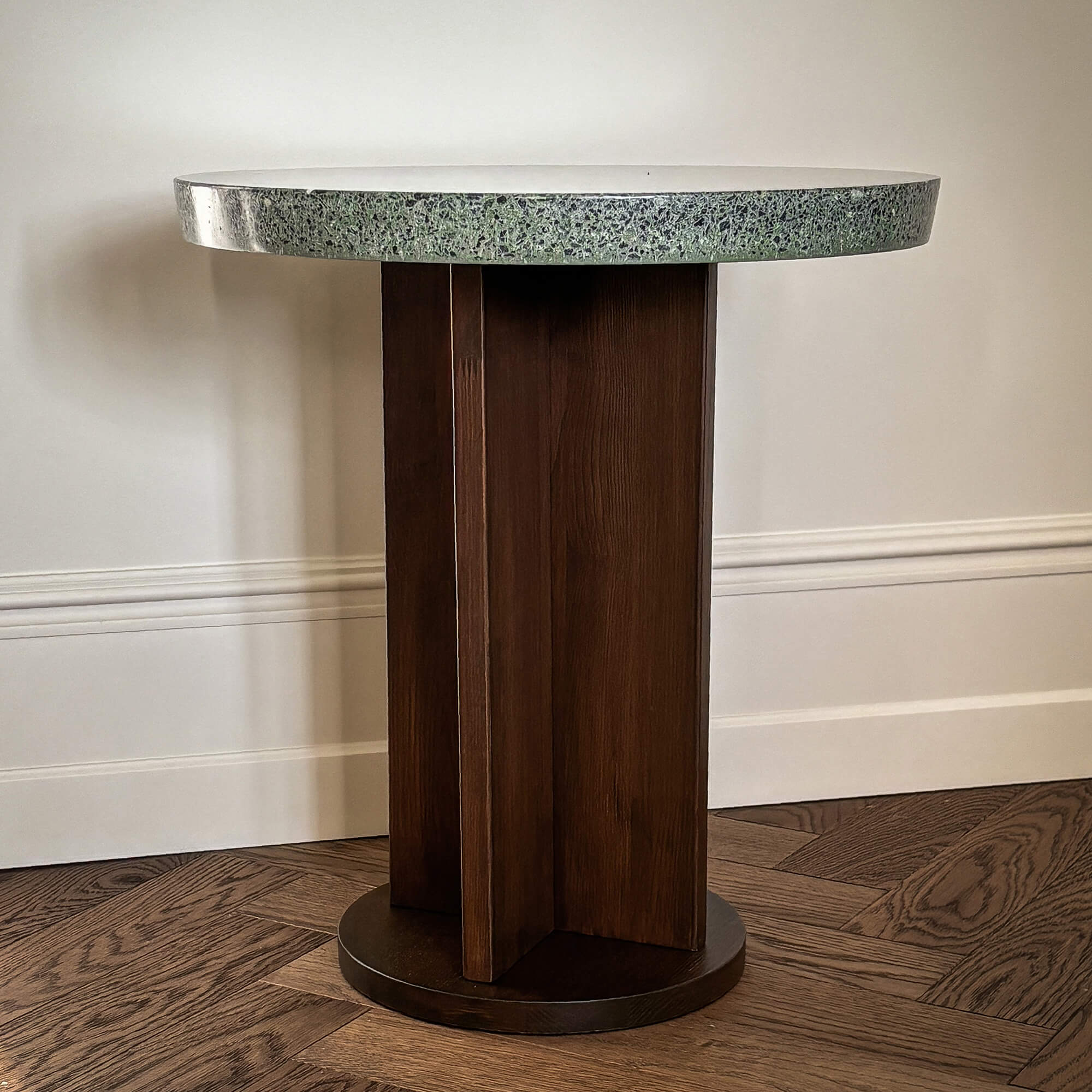Finish: Polished terrazzo stone, staines ash wood.