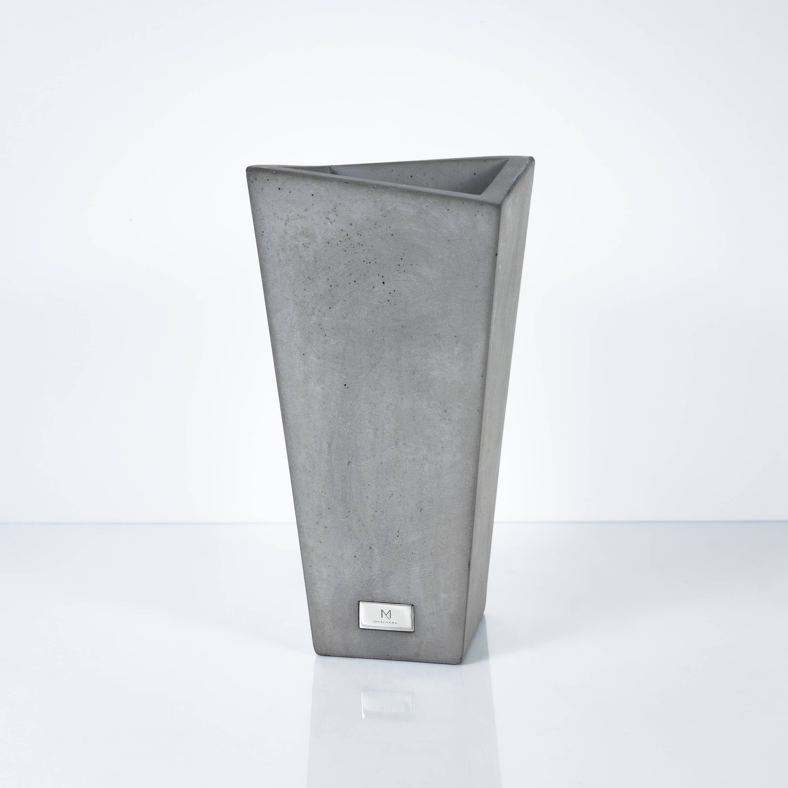 Uniquely shaped minimalist handmade vase made of ultra high performance reinforced concrete. Luxury combination of natural concrete imperfection and high gloss stainless steel element.