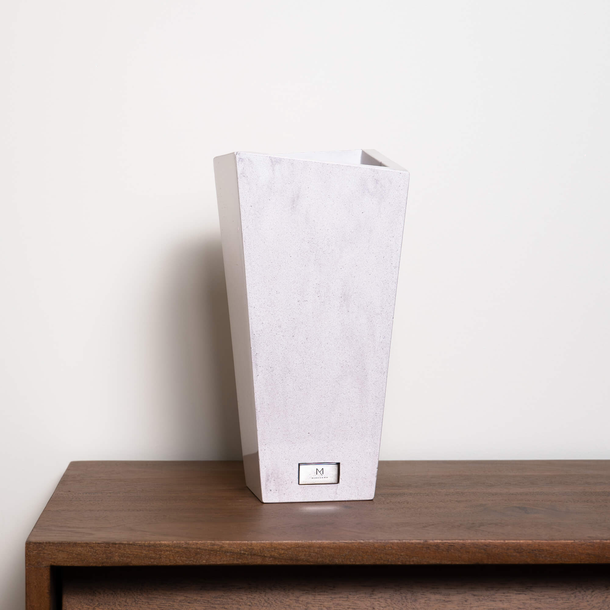 Uniquely shaped minimalist handmade vase made of precisely polished concrete. Pink marble texture combination with mirror finished stainless steel element.