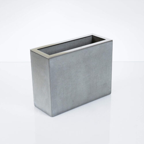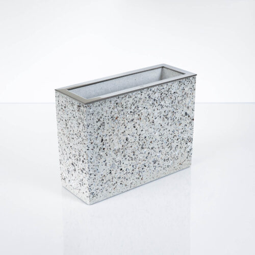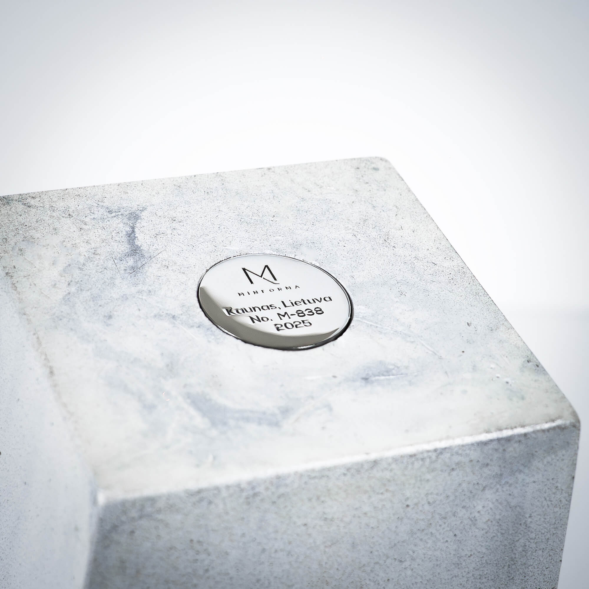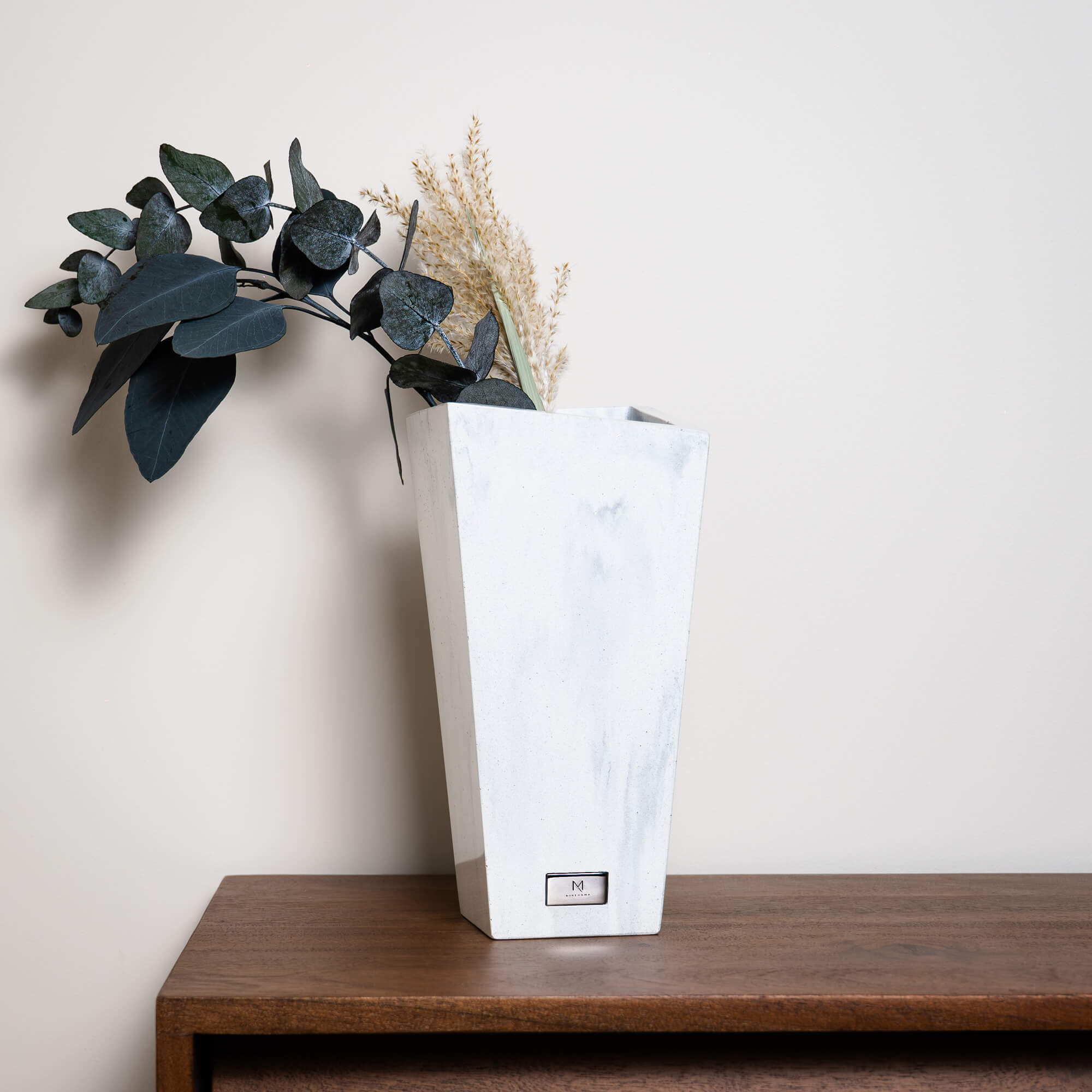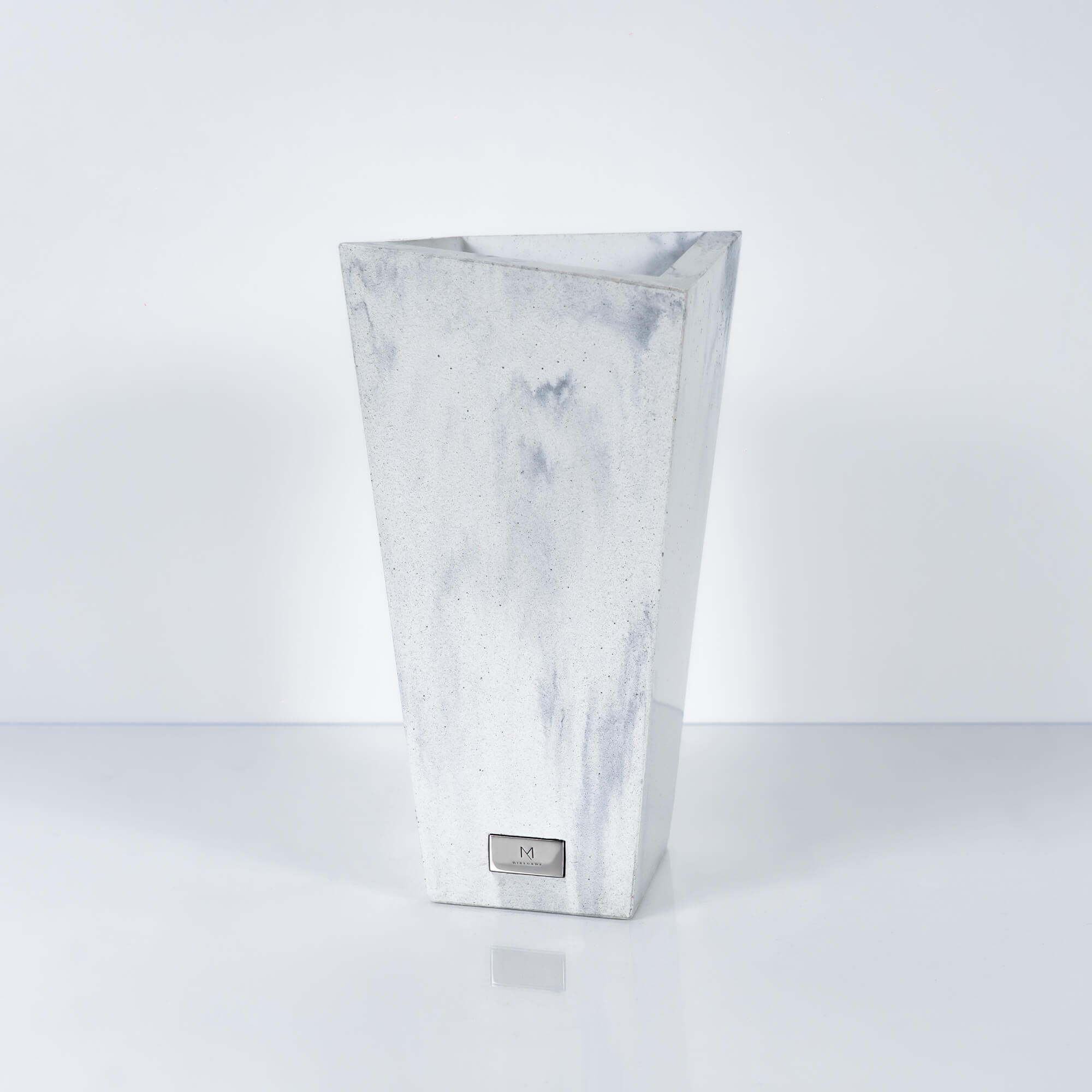 Uniquely shaped minimalist handmade vase made of precisely polished concrete. White marble texture combination with mirror finished stainless steel element.