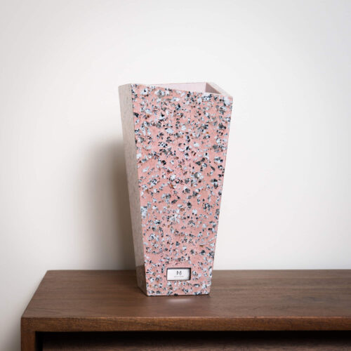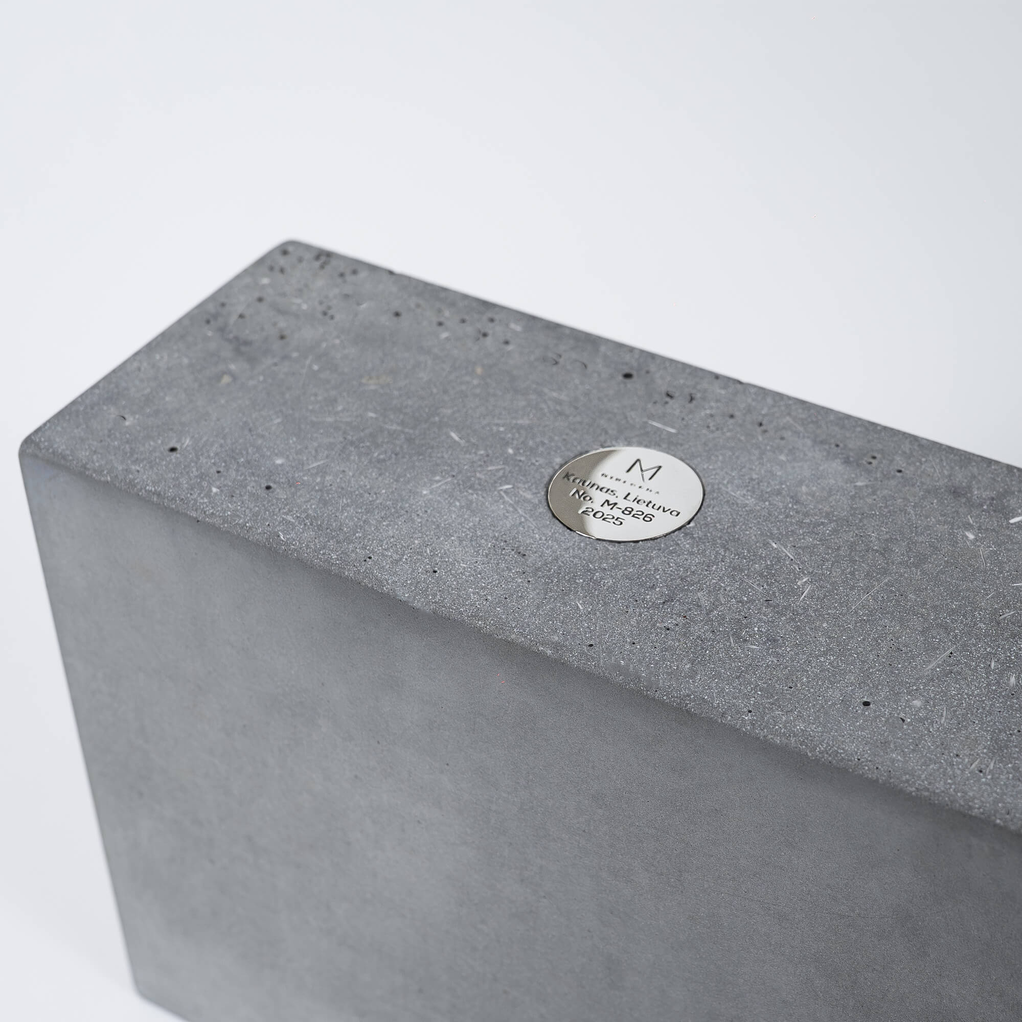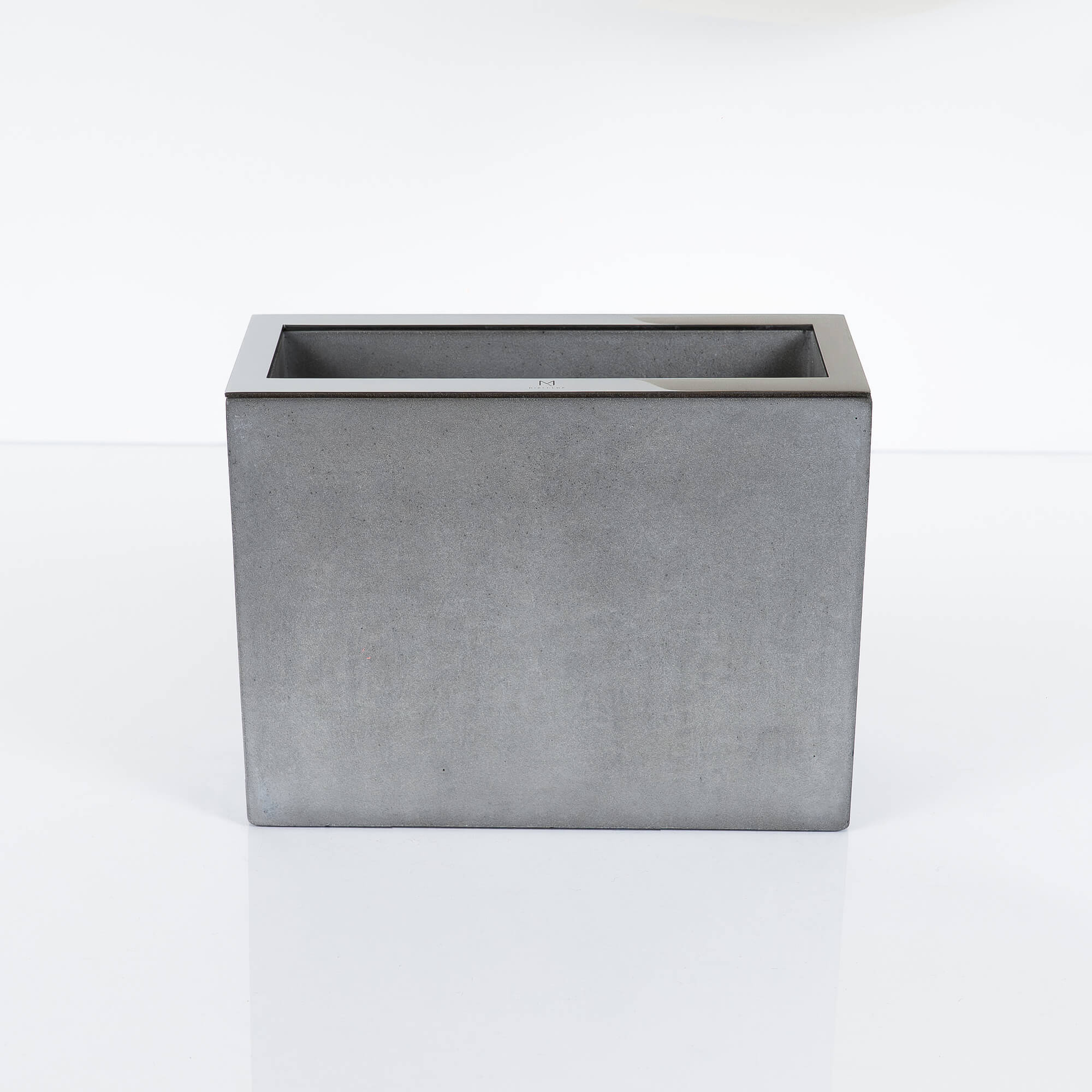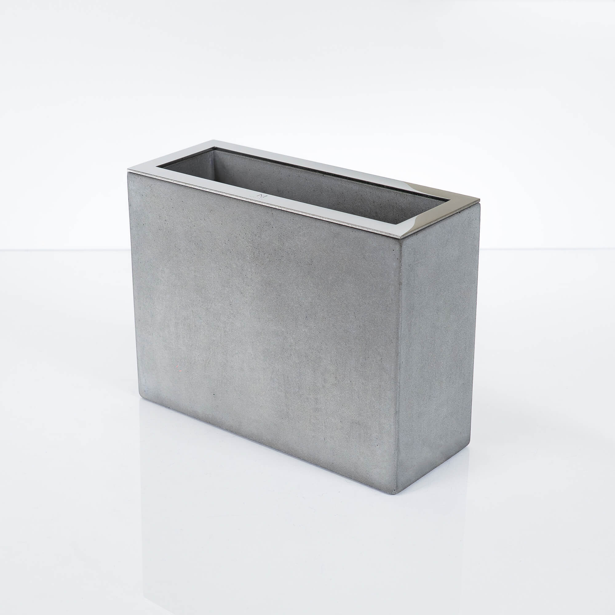 Rectangular handmade stone vase made of special reinforced concrete. Luxury combination of natural concrete imperfection and high gloss stainless steel element.